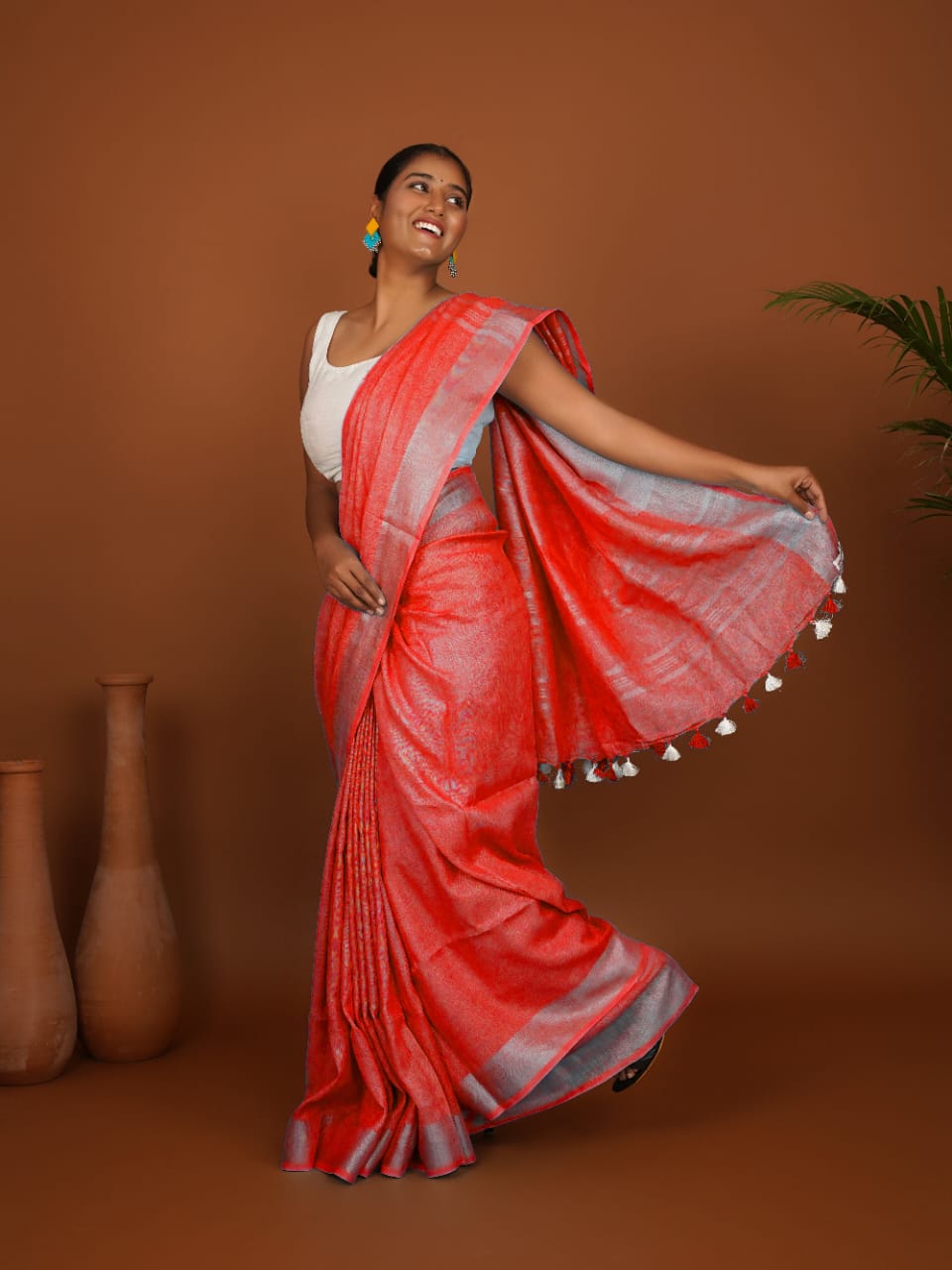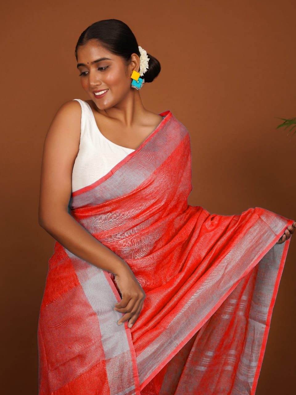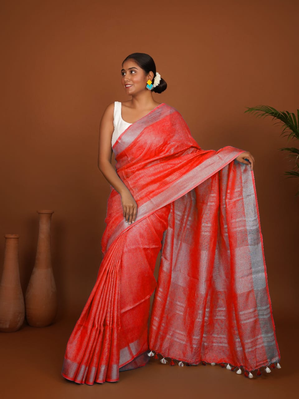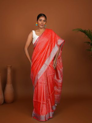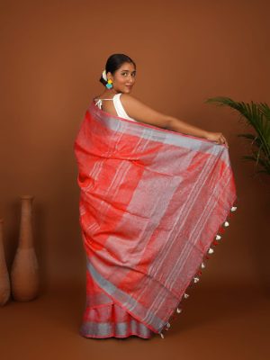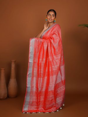 Coral Line Coral Red Handwoven Linen Saree